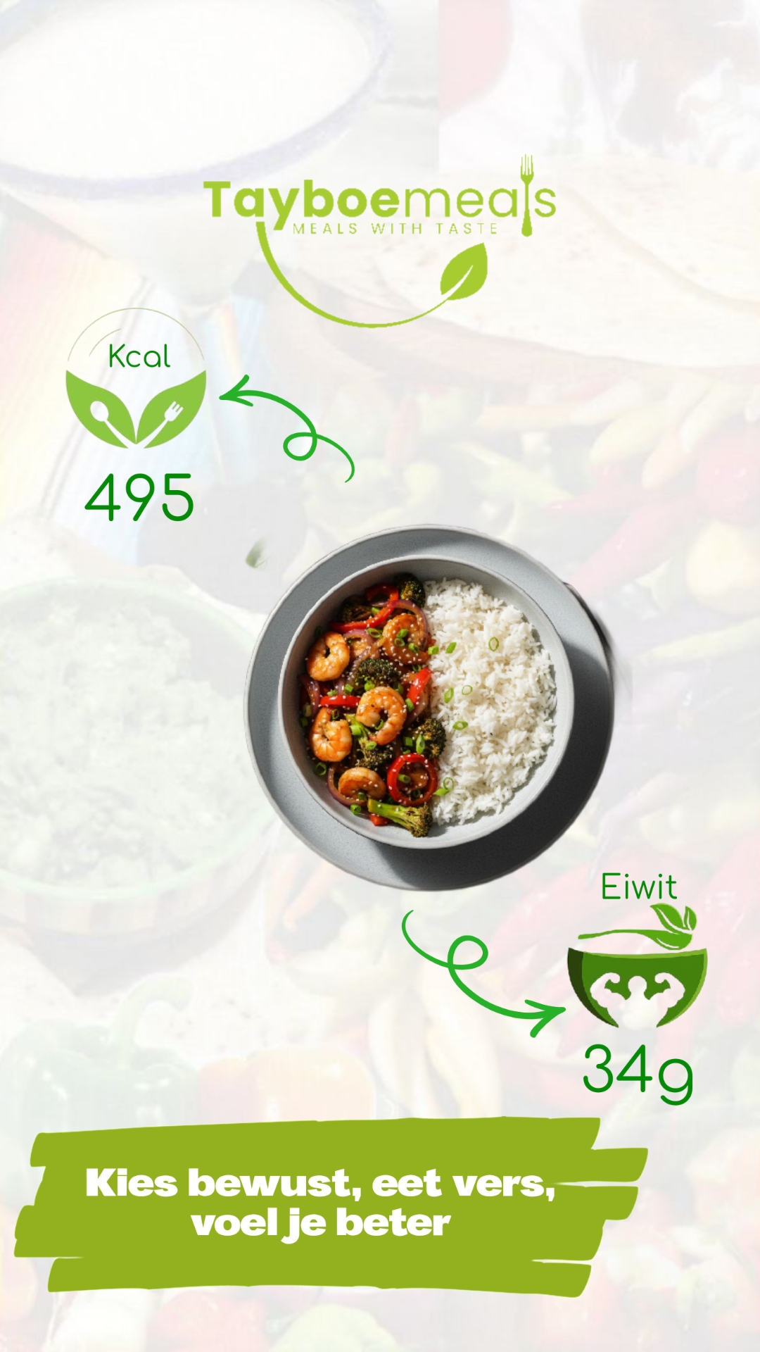 Duik in de Aziatische keuken met onze Teriyaki Garnalen Power Bowl! Sappige, perfect gekruide garnalen op een bedje van luchtige rijst, gecombineerd met knapperige broccoli en zoete paprika. Overgoten met een heerlijke teriyaki-sojasaus voor de perfecte balans tussen zoet en hartig. Een eiwitrijke en smaakvolle boost voor jouw dag, vers voor je bereid.